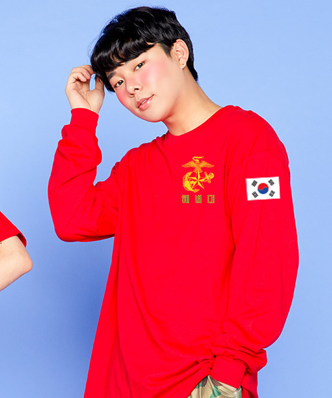 베이직 라운드 티셔츠 긴팔 레드 (왼가슴, 소매, 등해병대 인쇄)